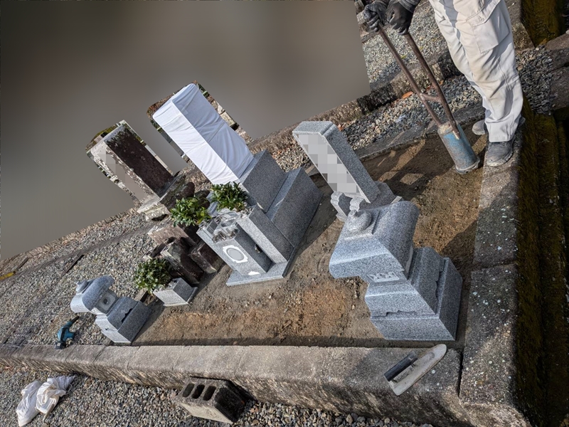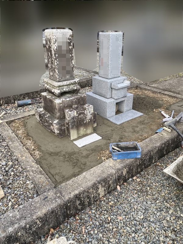 今回はブロックで区画されてる墓地に新規8寸石塔、灯篭を設置して古墓石を横に移設させていただきました。